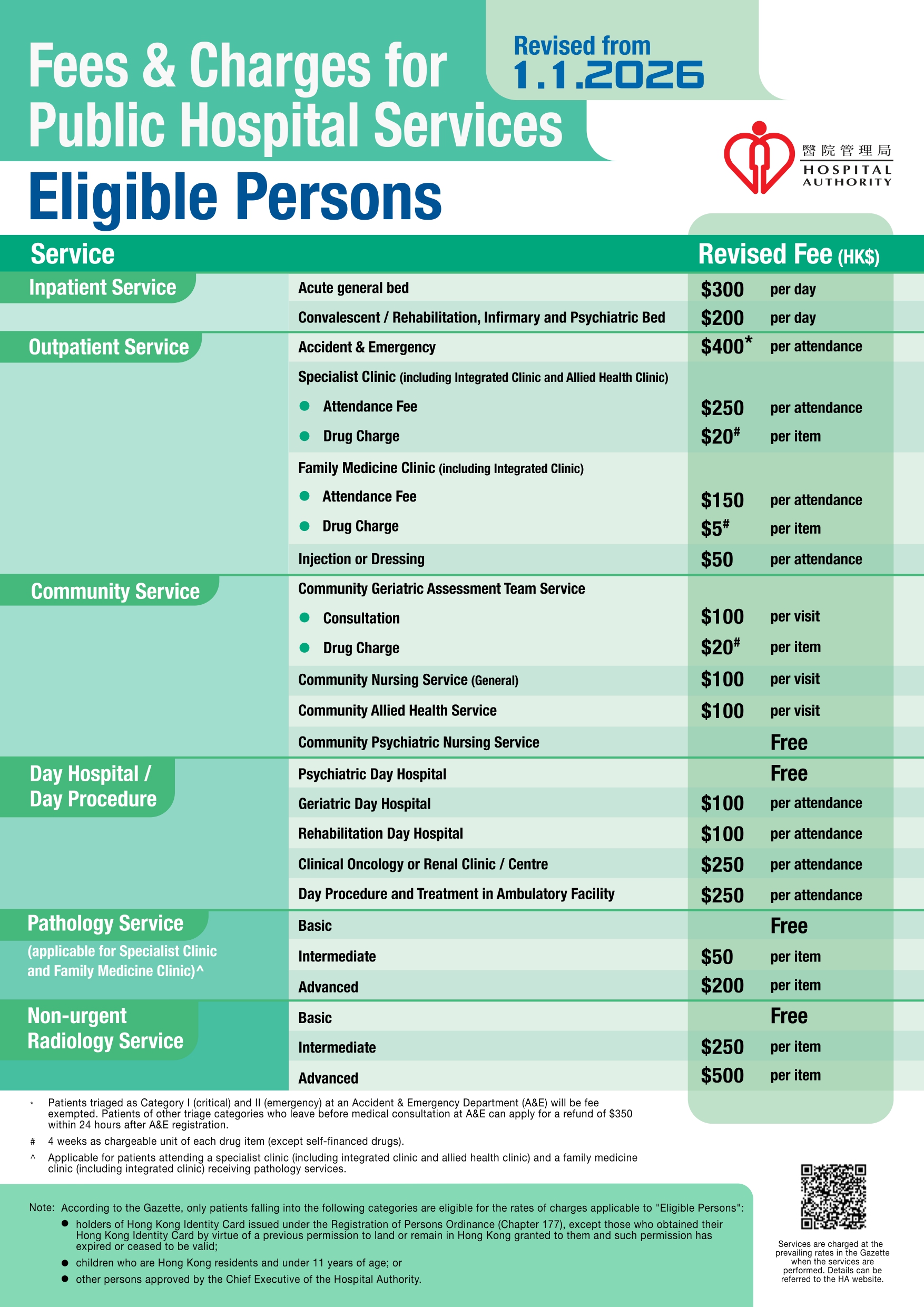 香港醫院管理局已於 2026 年 1 月 1 日起推行新一輪收費改革。新收費如下: