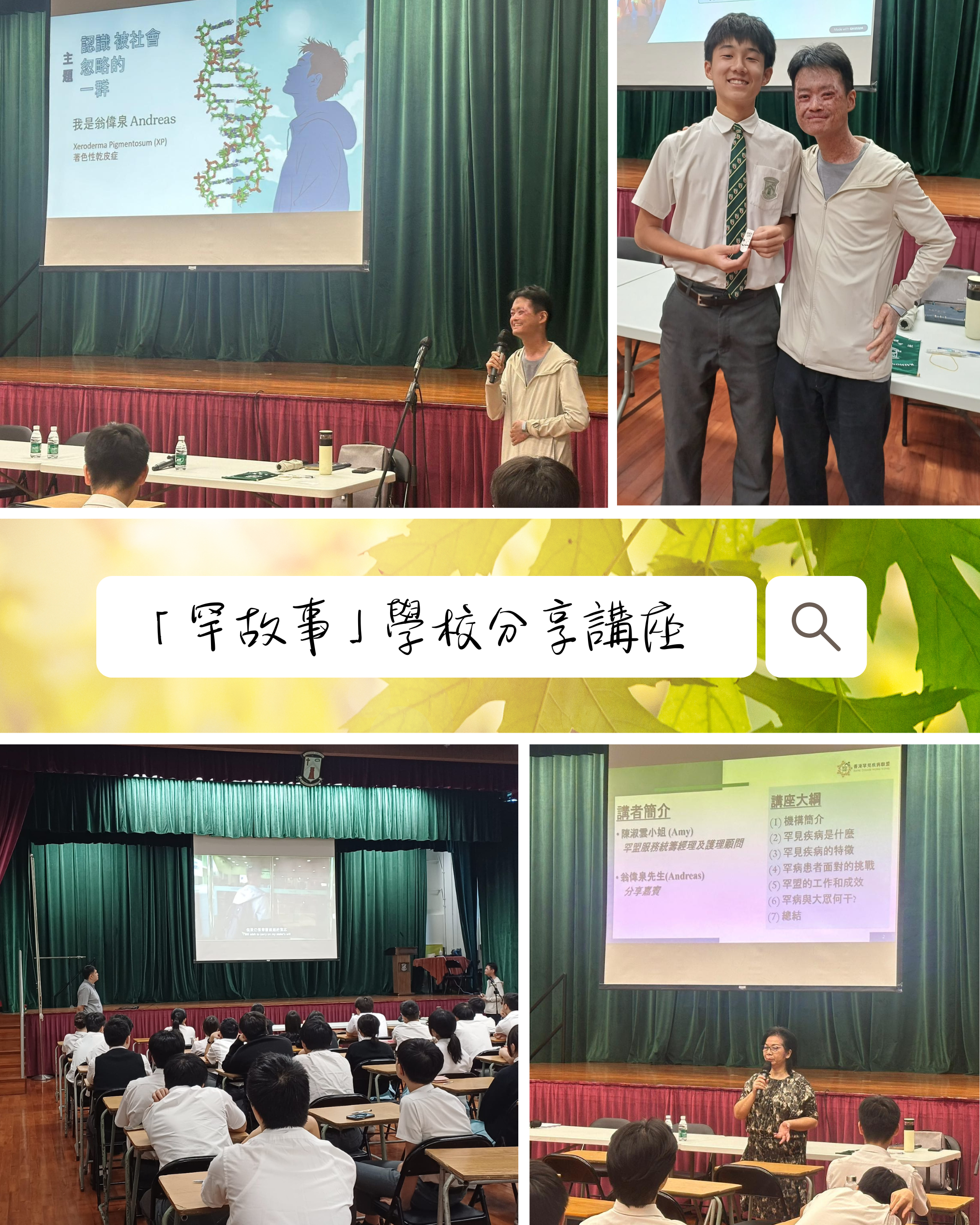 2025年10月9日,罕盟於高主教書院為130 位中五同學舉辦「罕故事學校分享講座」,主題為「認識被社會忽略的一群」。並特別邀請著色性乾皮症(Xeroderma Pigmentosum, XP)患者——翁偉泉先生(Andreas)擔任分享嘉賓,透過親身經歷,鼓勵同學們勇敢面對生命的挑戰。